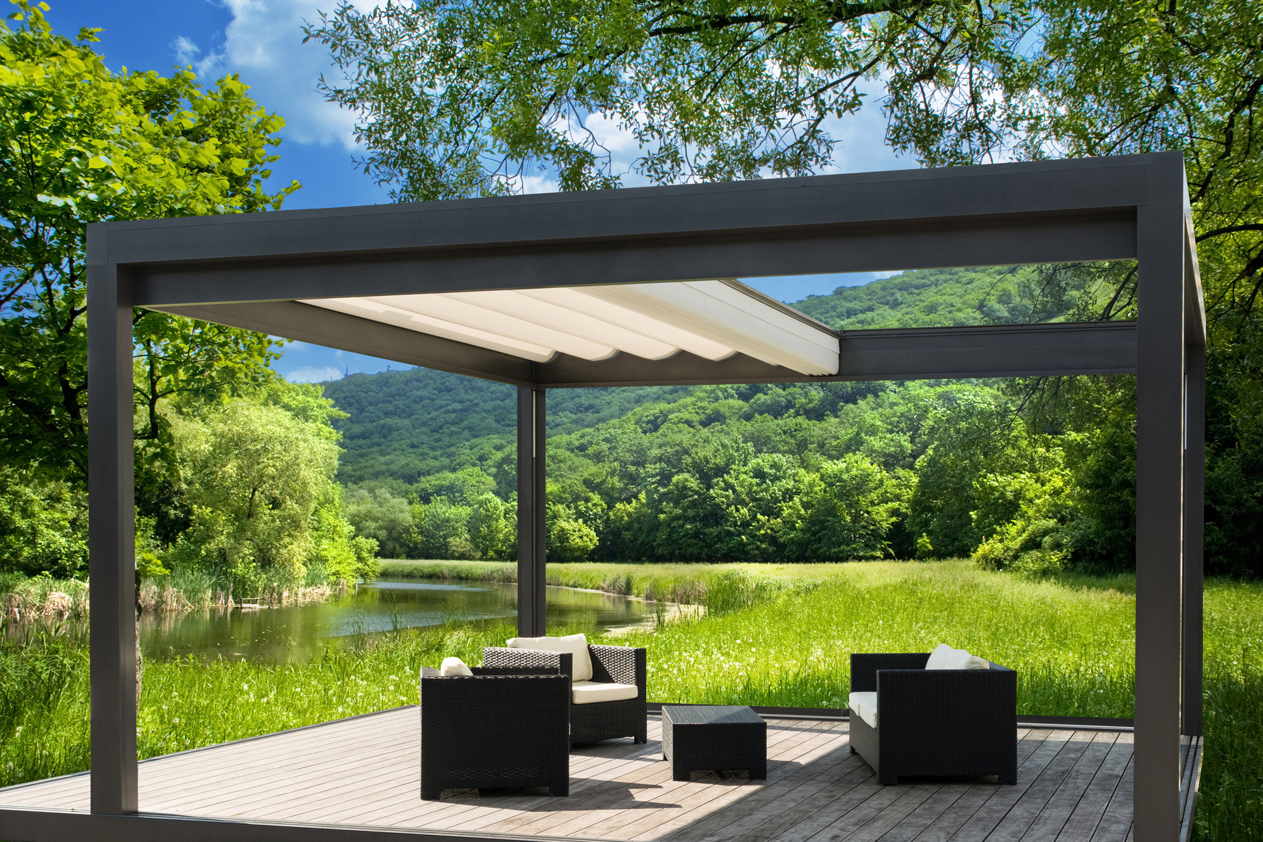 Wer darüber hinaus auch noch einen schattigen Platz auf der Terrasse haben und dabei die markante Gebäudestruktur betonen möchte, setzt auf eine Pergola oder einen Pavillon. Beide haben den Vorteil, dass sie durch den Wegfall von Schrägen optisch perfekt mit dem Wohnhaus harmonieren. Während eine Pergola direkt mit dem Gebäude verbunden wird, ist der Pavillon ein freistehender offener Kubus. Bei der Pergola setzt Klaiber einerseits auf das klassische Markisentuch, anderseits auf wasserabweisende hochwertige PVC Stoffe. Beim Pavillon kann alternativ ein Hardtop aus drehbaren Aluminium-Lamellen eingebaut werden. Für die seitlichen Flächen stehen Senkrechtmarkisen oder Seitenverglasungen zur Verfügung. Auf Wunsch sorgt eine harmonisch integrierte, dimmbare LED-Beleuchtung für Terrassengenuss bis tief in die Nacht.