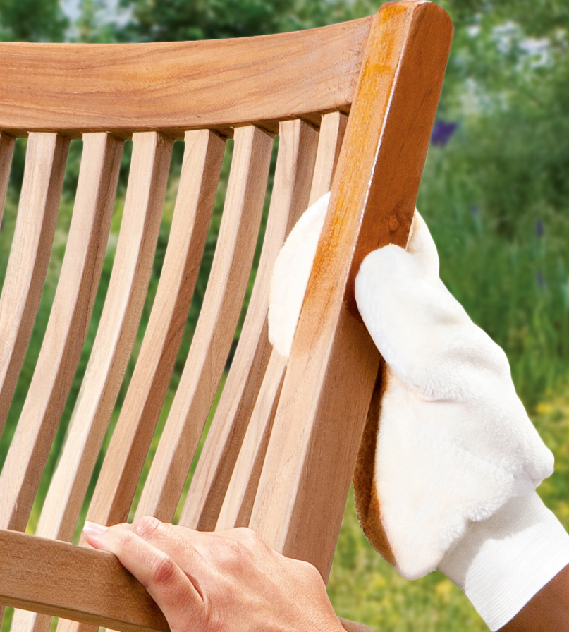 Zunächst sollte darauf geachtet werden, dass die Möbel sauber und trocken sind. Für leichte Verschmutzungen eignet sich eine Bürste. Kleine Splitter werden mit feinem Sandpapier abgeschliffen. Um Gartenmöbel von Vergrauungen zu befreien, sollten Spezial-Reiniger, zum Beispiel Xyladecor Holz-Reiniger und Entgrauer, verwendet werden. Dieser sollte mindestens 10 Minuten einwirken und anschließend mit einer harten Bürste oder einem Schrubber in das Holz eingearbeitet werden. Nach dem Reinigungsvorgang wird mit viel Wasser gründlich nachgespült. Die so vorbereiteten Möbelstücke können dann mit verschiedenen Produkten behandelt werden. Eine effiziente Möglichkeit mit hoher Qualität bieten Pflege-Gele von Xyladecor, die kinderleicht und ohne zu tropfen verwendbar sind. Das Gel kann sogar ohne Pinsel mit einem speziellen Hartholz-Pflege-Handschuh dünn und gleichmäßig aufgetragen werden. Die Gel-Konsistenz sorgt dafür, dass Tropfen und Kleckern vermieden werden. Nach dem ersten Auftrag und anschließender Trocknung, wird das Gel ein zweites Mal aufgebracht. So entsteht eine harmonische Oberfläche, das Holz wird aufgefrischt und die Holzmaserung betont. Die Pflege-Gele sind in Teak, Eukalyptus und Hartholz erhältlich.
