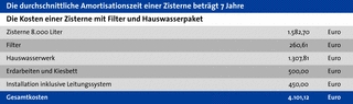 Werden Investitionskosten und das durch eine Betonzisterne vorliegende Einsparpotenzial ins Verhältnis gesetzt, steht nach einer Nutzungsdauer von 30 Jahren eine Ersparnis von knapp 18.000 Euro zu Buche.